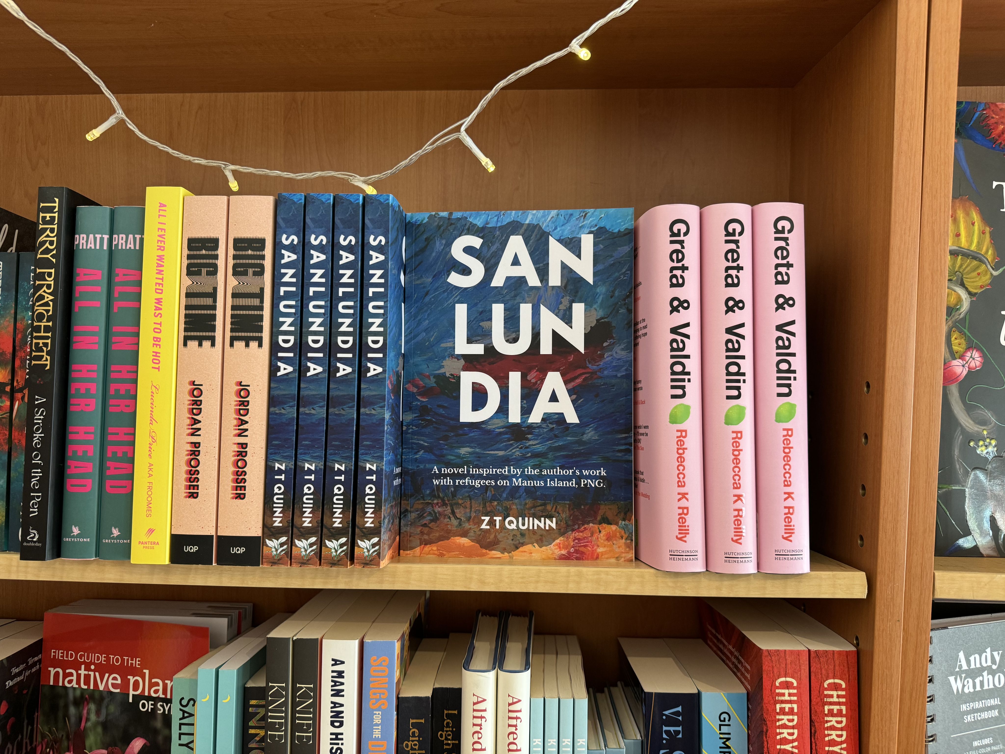 Co-owner Zac Quinn's book Sanlundia, a work of fiction loosely based on his experiences working on Manus Island.