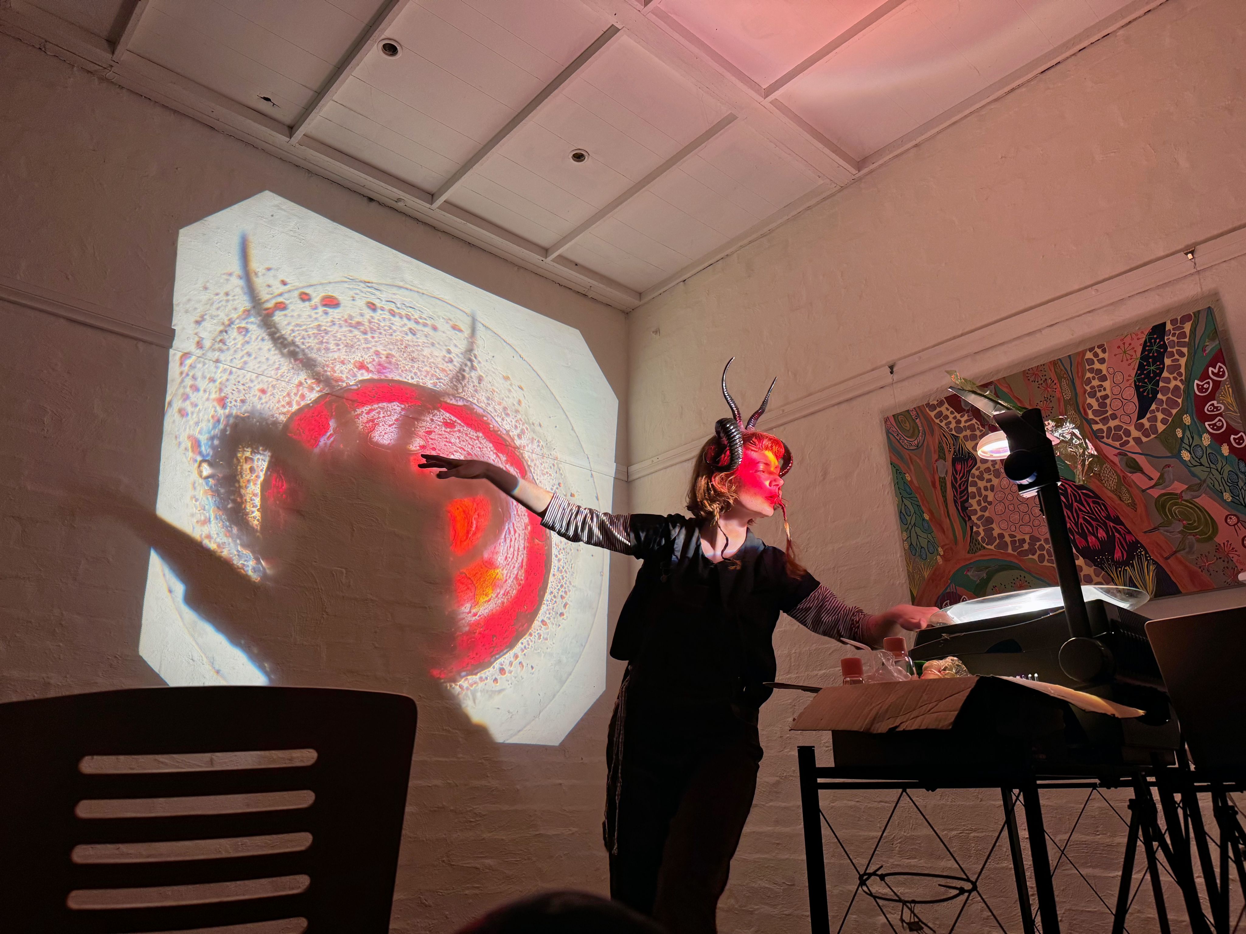 Local artist Bria McCarthy performing her shadow puppet show Dragon Hearts at Rosey Ravelston.