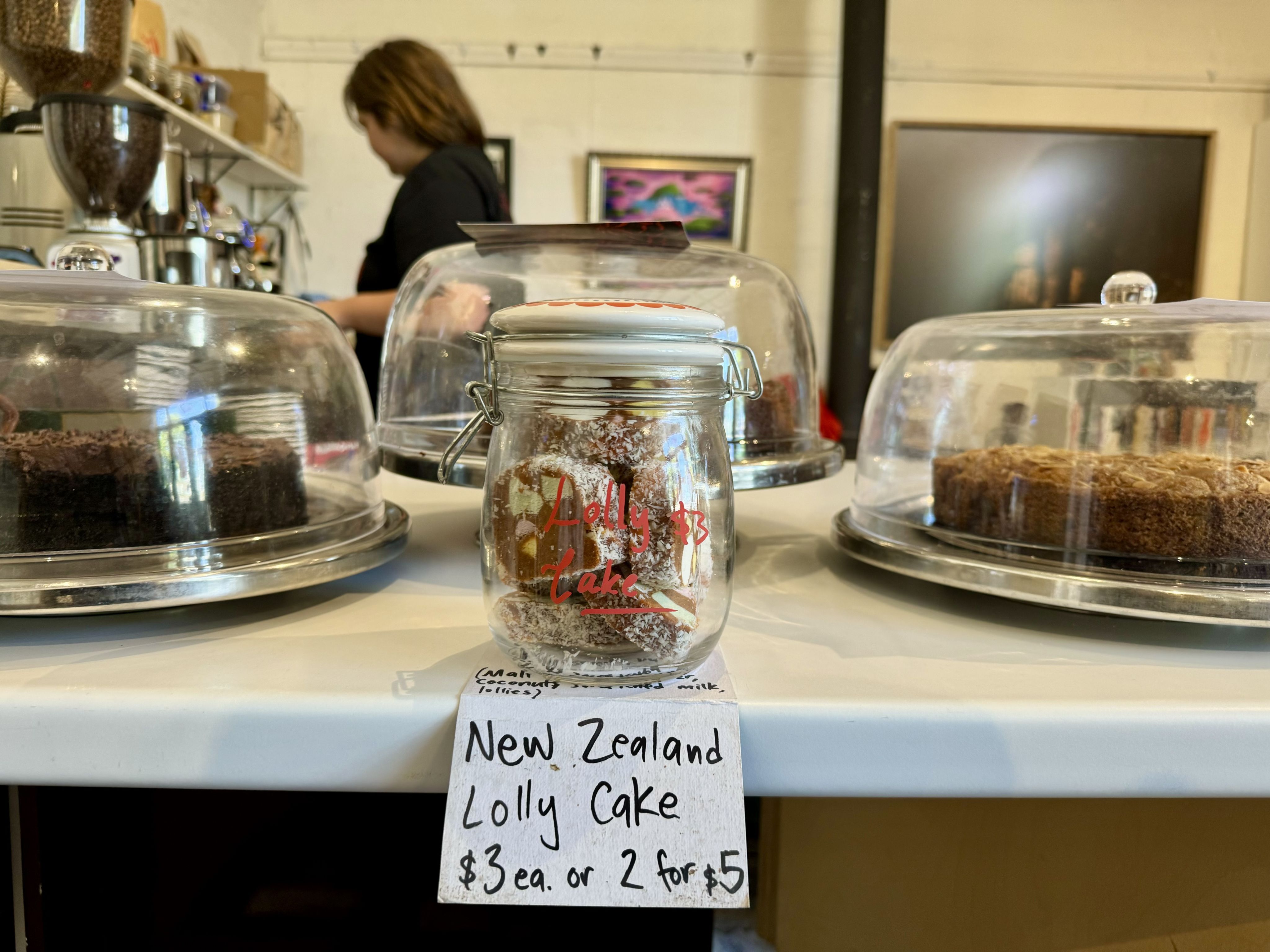Jo’s daughter wanders up, wrapped in a colourful blanket Jo crocheted for her as a baby. She loves the New Zealand Lolly Cake Rosey stocks, which she describes as “that cake-ish thingy that has marshmallows and coconut on the outside” a nod to Catherine’s childhood, Jo says Catherine “brought her own personality and story” to it, “it’s that personal touch that also helps.”